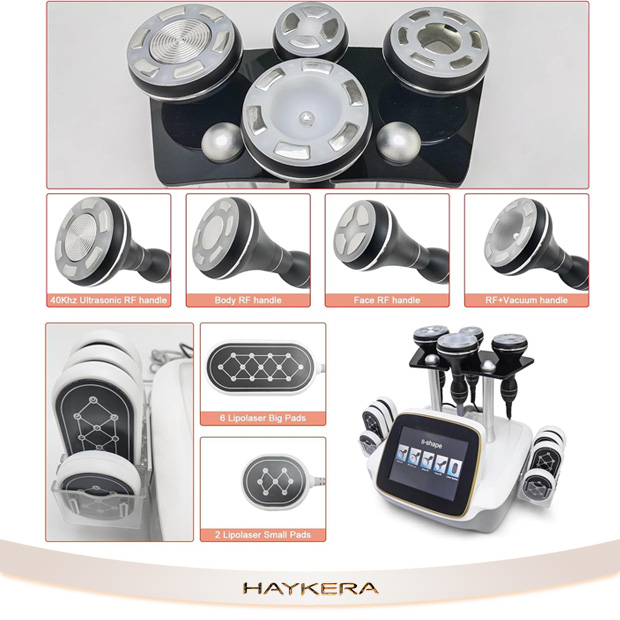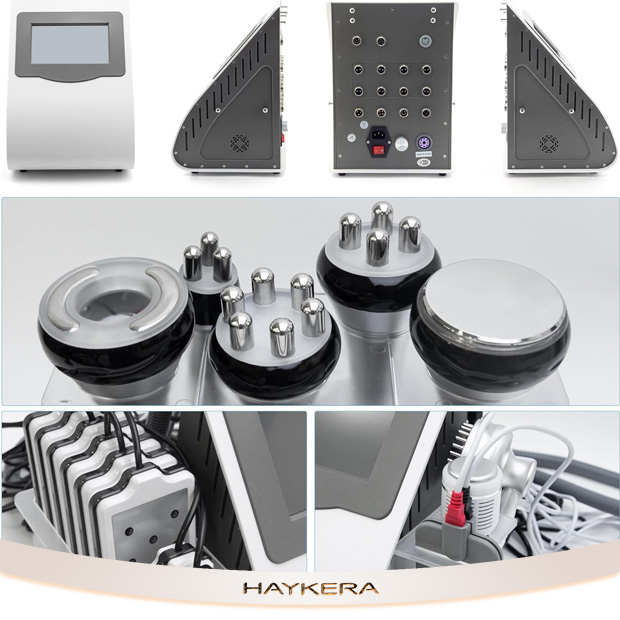 This machine integrates sextupole RF handle, 40K cavitation, vacuum RF, 3-pole RF, 4-pole RF, cold hammer, microcurrent & photon handle, and laser paddles, offering treatments for the face, neck, waist, thighs, arms, and back.