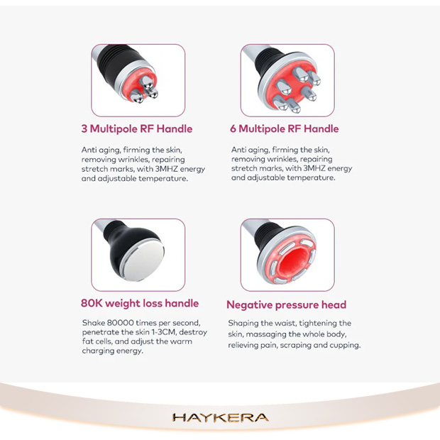 5-in-1 Multifunctional Handles: Includes 80K Cavitation, Tripolar RF, 4-Pole RF, 6-Pole RF, and Vacuum RF, targeting multiple body and facial areas.